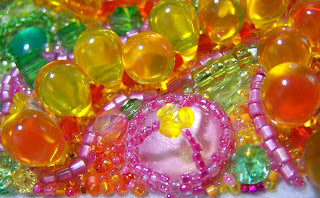 I used glass beads, resin pendant, gemstone, seed beads, silk ribbon, shells, and my own shimmerstone cabochons. I'm particularly proud of thinking to use the ribbon.